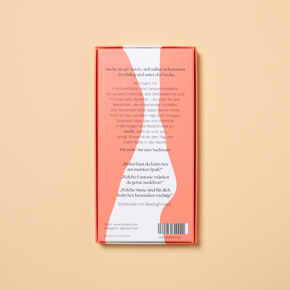 nackt. ist ein Anreiz, sich näher zu kommen – im Dialog und unter der Decke. Das Fragenset umfasst 90 Fragen für Frischverliebte und Langverheiratete, für queere Liebende, alte Bettbekannte und Friends with Benefits – kurzum für alle Menschen, die miteinander schlafen. Das Kartenset wurde mit Sexolog*innen entwickelt und regt zum mutigen Gespräch über Sex und Intimität, Erfahrungen und Bedürfnisse an.